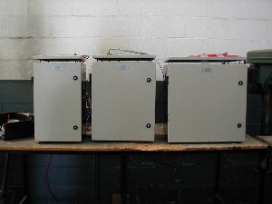 Inverters and battery charger are supplied in 2mm steel boxes with front open door. Removable lid on top for ventilation. Fan activated by temperature switch at 60 degrees.
